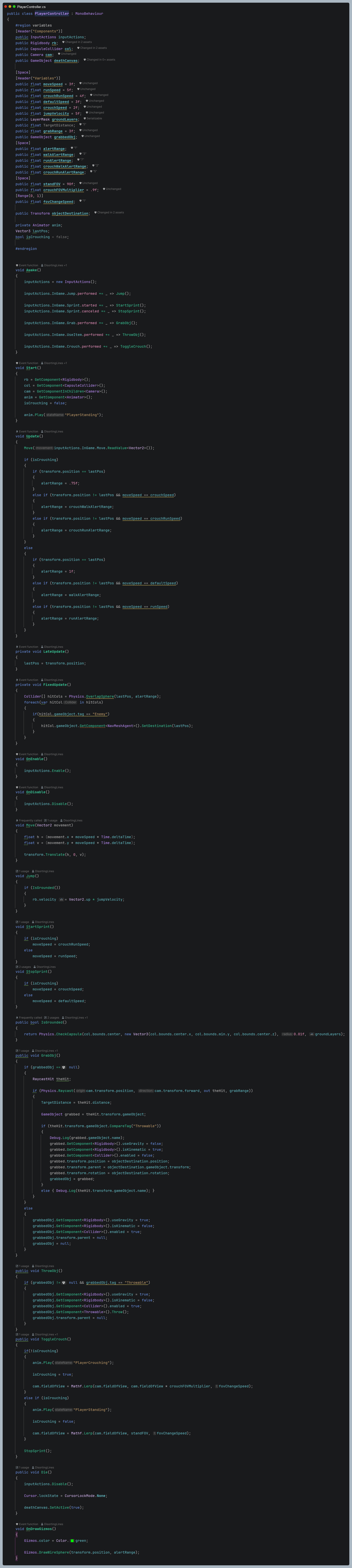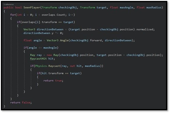 The enemies would randomly patrol through the level, using random points in a sphere cast around them to determine their next location. They would also react to and seek out objects that were thrown near them, and the player if they’d walk near them. The range the player was detected was also impacted by whether the player was crouching or sprinting.